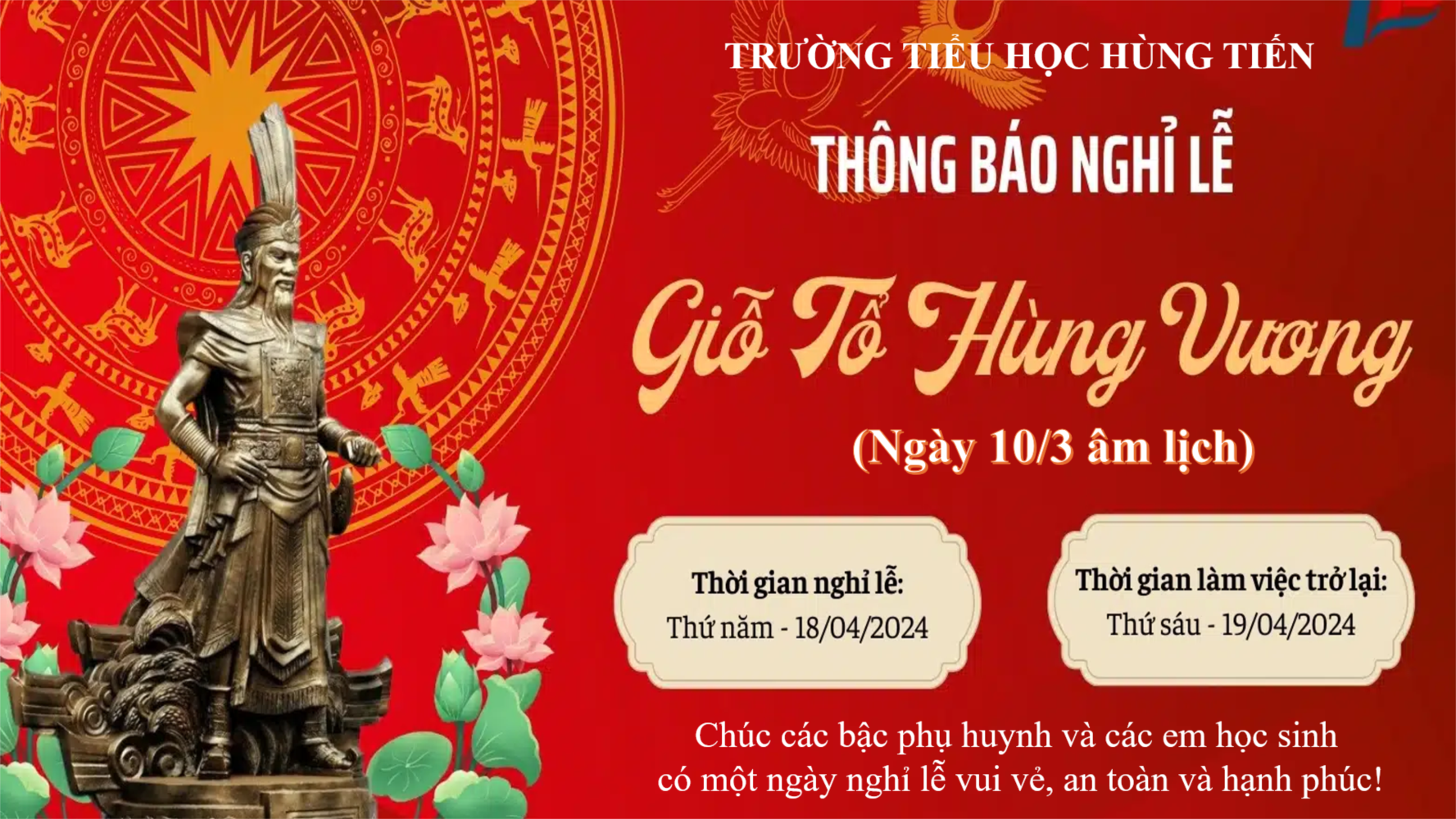 Thông báo: Để đảm bảo an toàn khi tham gia giao thông dịp Giỗ Tổ Hùng Vương, các bậc phụ huynh và các em học sinh cần chấp hành pháp luật về trật tự, an toàn giao thông, điều khiển phương tiện đúng tốc độ, giữ khoảng cách an toàn, tuyệt đối không điều khiển phương tiện khi đã sử dụng rượu, bia. Trân trọng!